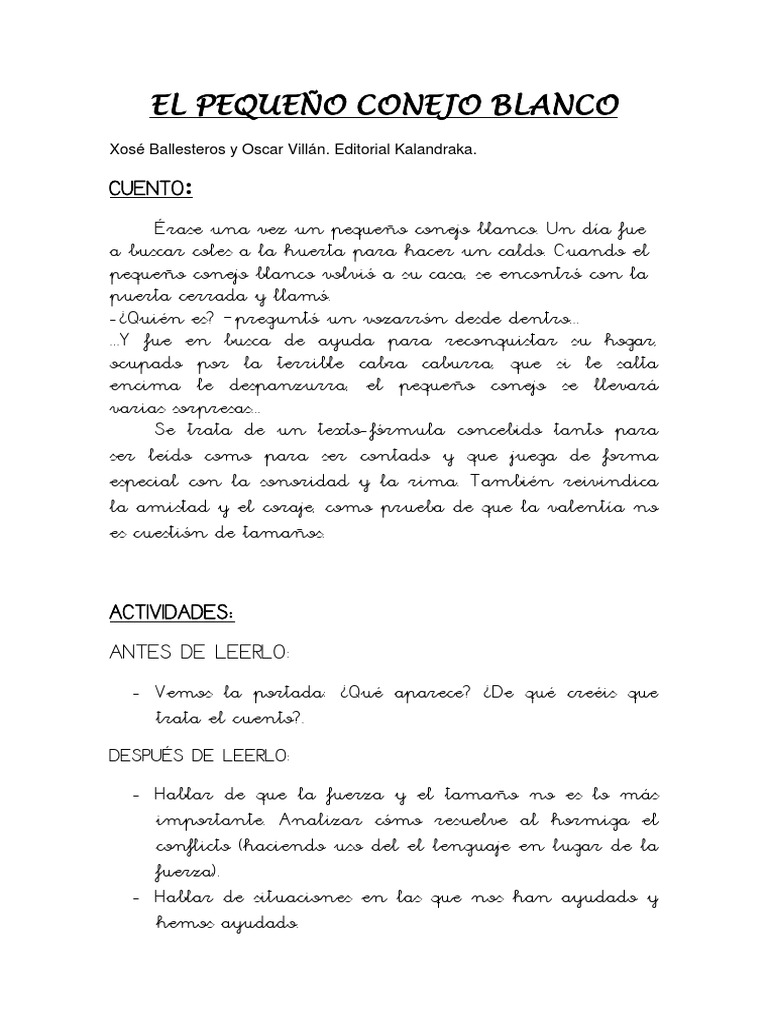 El Pequeo Conejo Blanco by charodig. 10 alimentos que cambiaran tu vida. El pequeo conejo blanco Se trata de un clsico cuento portugus juega con la sonoridad de las palabras como hilo conductor del tema en el que un pequeo conejo blanco sale de su casa para ir a la huerta a coger coles y preparar un rico caldo pero al volver a casa se encuentra con la puerta cerrada y llam.